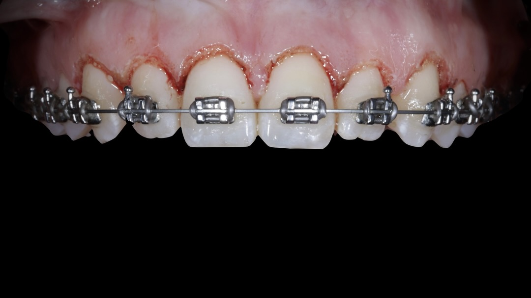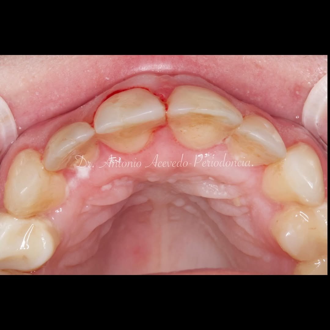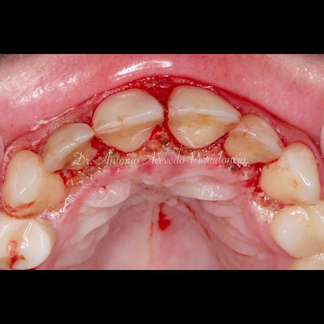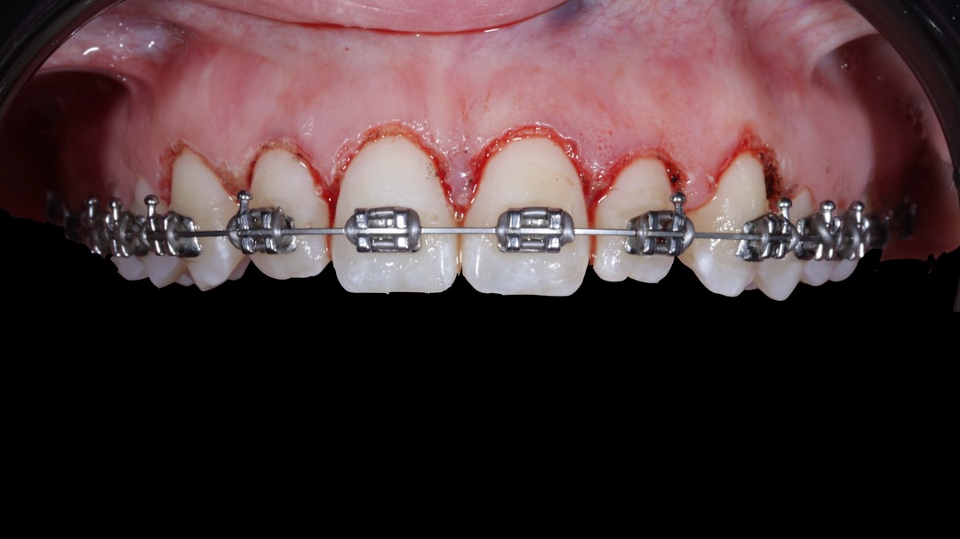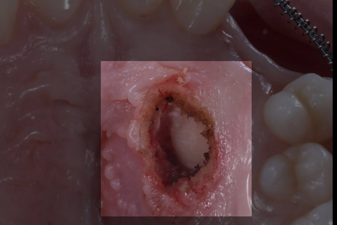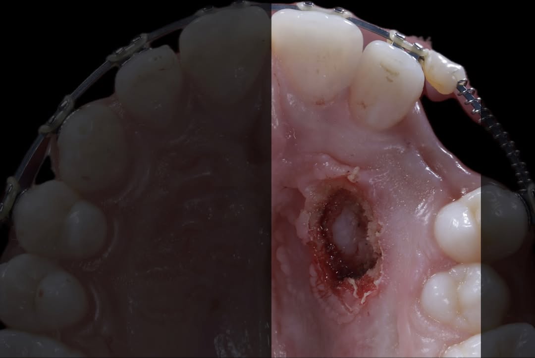 Ya se han realizado la extracción de los dientes 12, 11, 21, 22 para garantizar el cierre de tejidos blandos. El día de la cirugía, el alumno verá todo el procedimiento en una pantalla en directo en la sala de cirugía, ya que todo será realizado con un microscopio operatorio.
