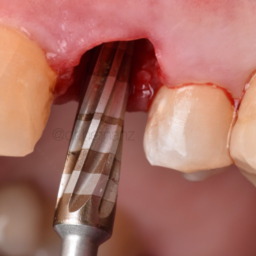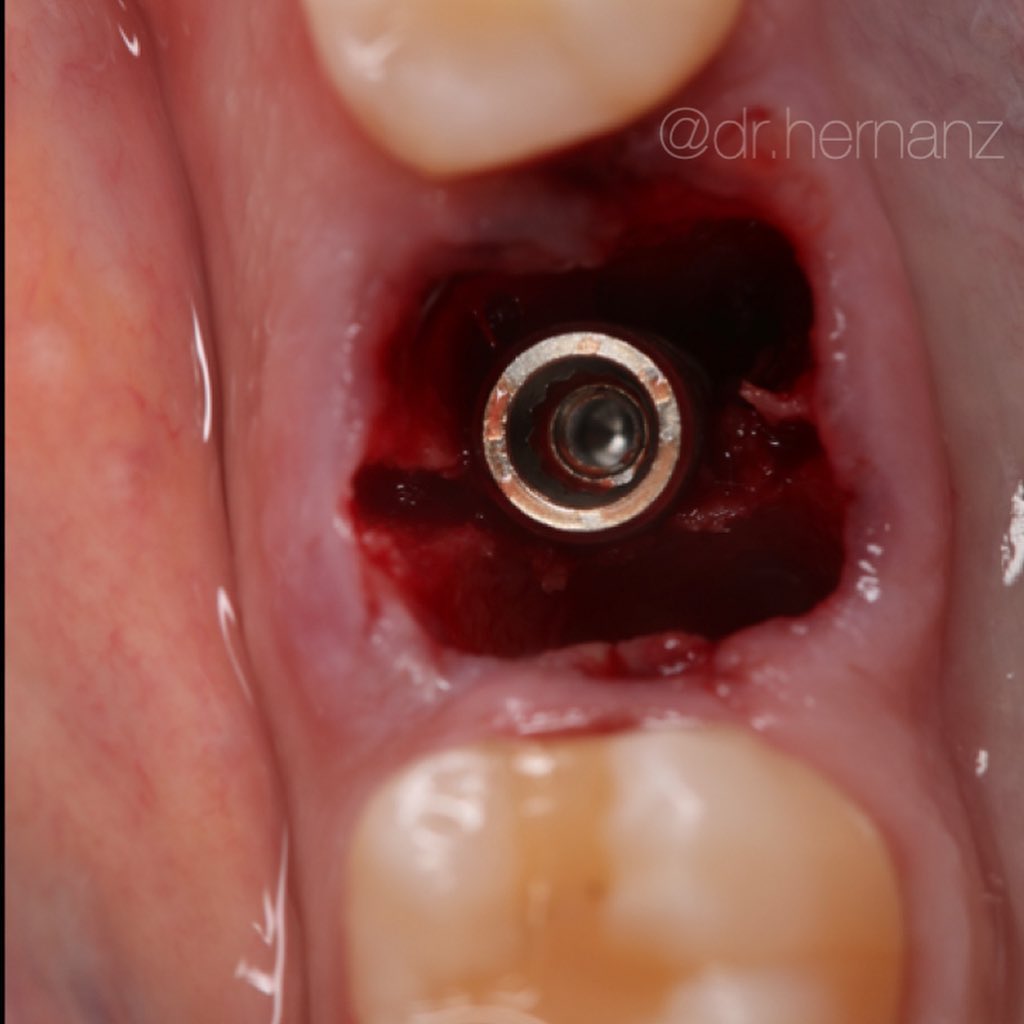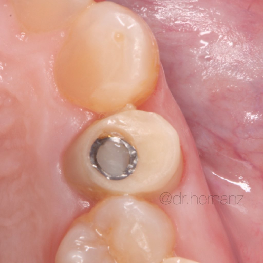 Paciente que presenta fractura del 1.1., a consecuencia de una reabsorción radicular previa. Se realiza la extracción de la pieza, con legrado minucioso del lecho. Se coloca un implante de superficie híbrida, en posición protésicamente guiada. Se obtiene un injerto de tejido conectivo, suturado en sobre vestibular. Se rellena el gap con aloinjertocorticoesponjoso, mezclado con L-PRF. Siguiendo la filosofía "One Abutment, One Time", se coloca un pilar de 10º no rotatorio de 3 mm de emergencia estrecha. Se adapta la corona provisional sobre un pilar tallable, para favorecer una cicatrización guiada por el futuro perfil de emergencia. Se restaura con una corona cementoatornillada de circonio sobre interfase no rotatoria.