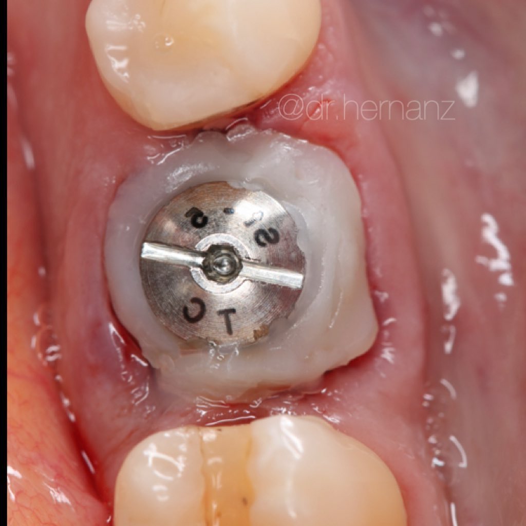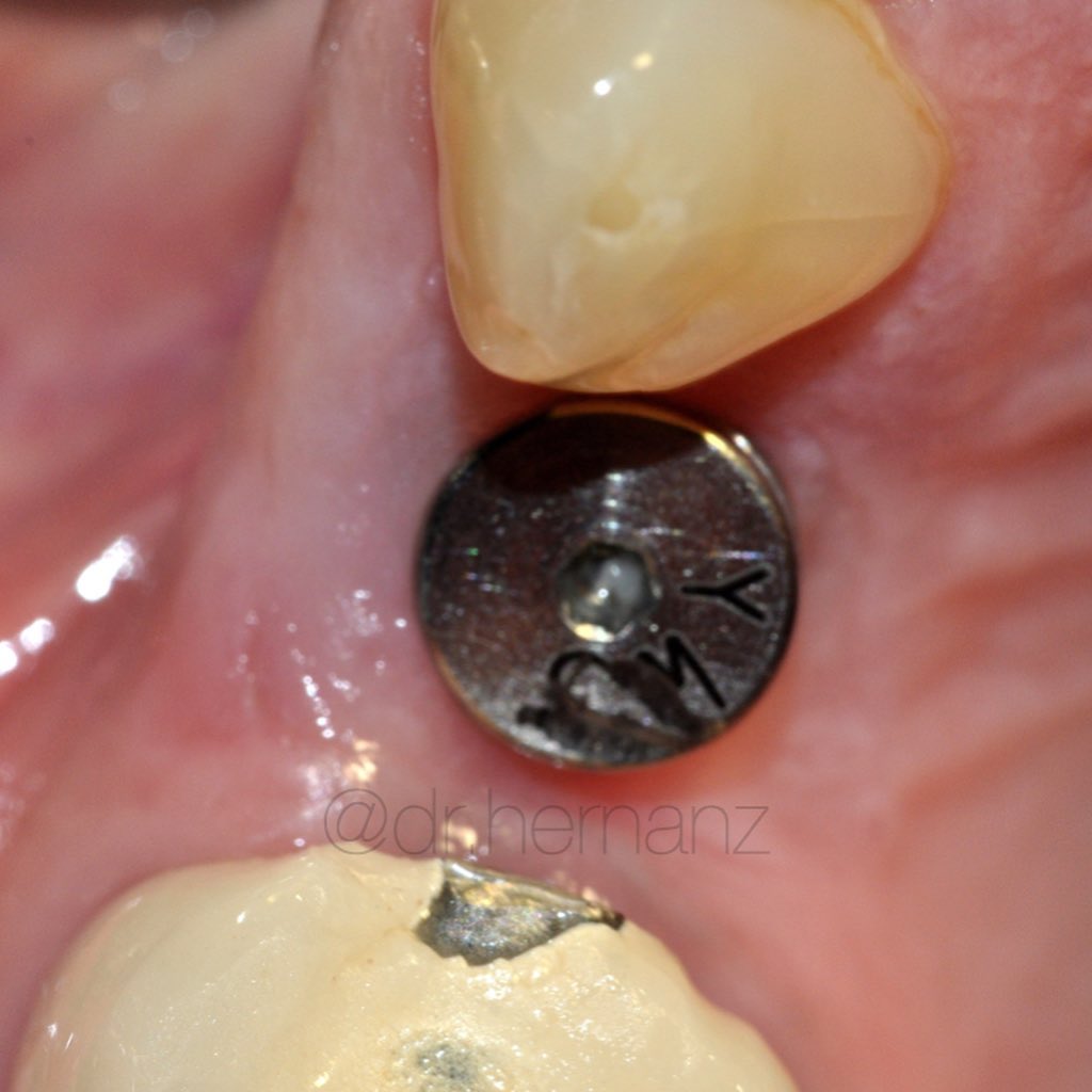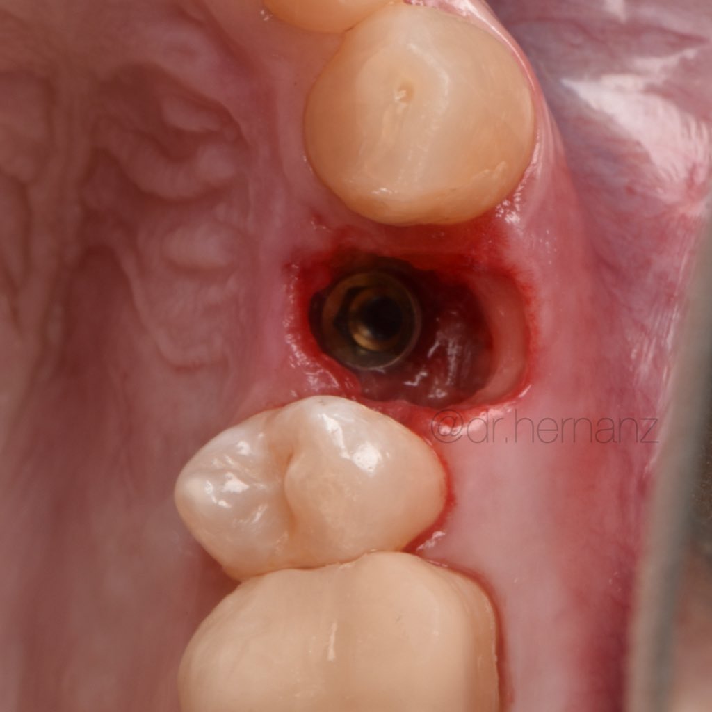 Paciente que presenta fractura del 1.1., a consecuencia de una reabsorción radicular previa. Se realiza la extracción de la pieza, con legrado minucioso del lecho. Se coloca un implante de superficie híbrida, en posición protésicamente guiada. Se obtiene un injerto de tejido conectivo, suturado en sobre vestibular. Se rellena el gap con aloinjertocorticoesponjoso, mezclado con L-PRF. Siguiendo la filosofía "One Abutment, One Time", se coloca un pilar de 10º no rotatorio de 3 mm de emergencia estrecha. Se adapta la corona provisional sobre un pilar tallable, para favorecer una cicatrización guiada por el futuro perfil de emergencia. Se restaura con una corona cementoatornillada de circonio sobre interfase no rotatoria.
